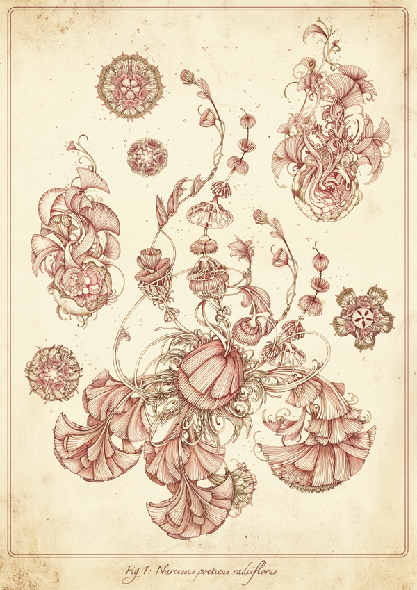 Intricately detailed, ancient looking illustrations of ficticious flora - "
