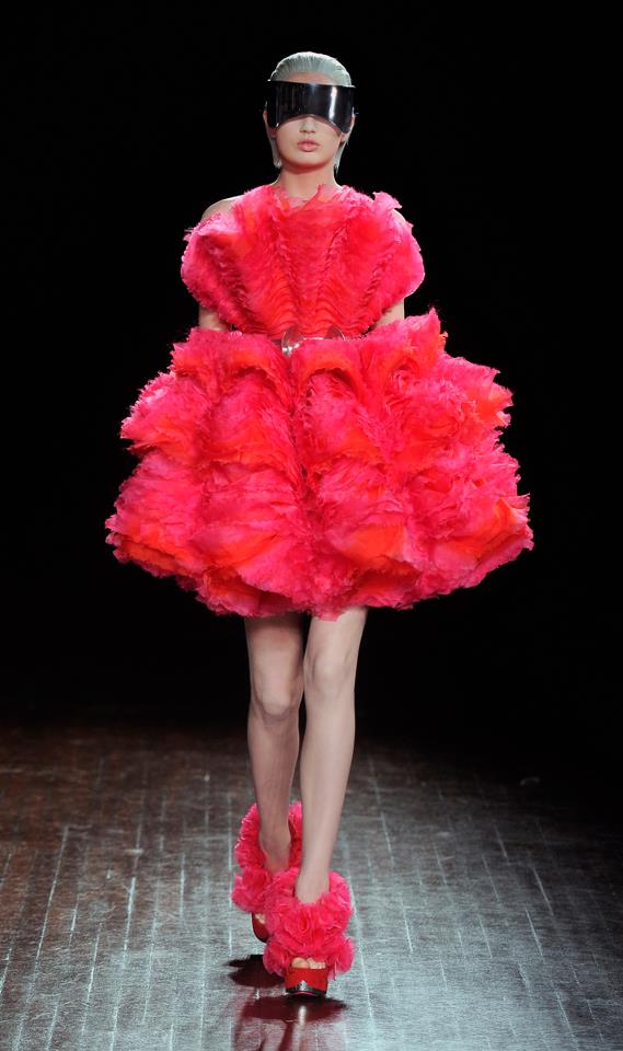 Sarah Burton's created an awe inspiring spectacle in Paris with a palette of vibrant pink to black and soft blush pink. Alexander McQueen's ready to wear collection featured feathers and ruffles in fantastic sihouettes, the inspiration drawn from the underneath of mushrooms.